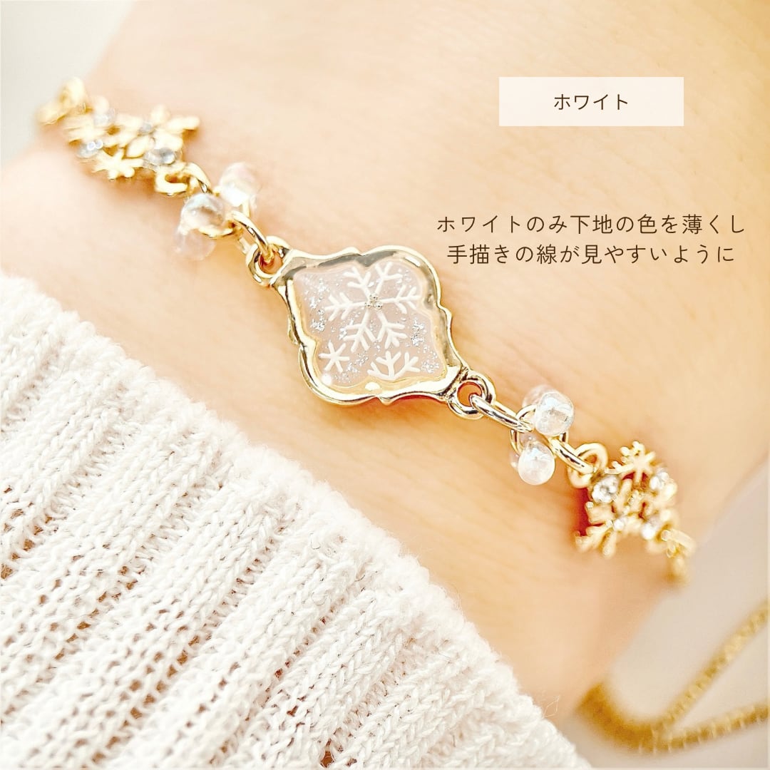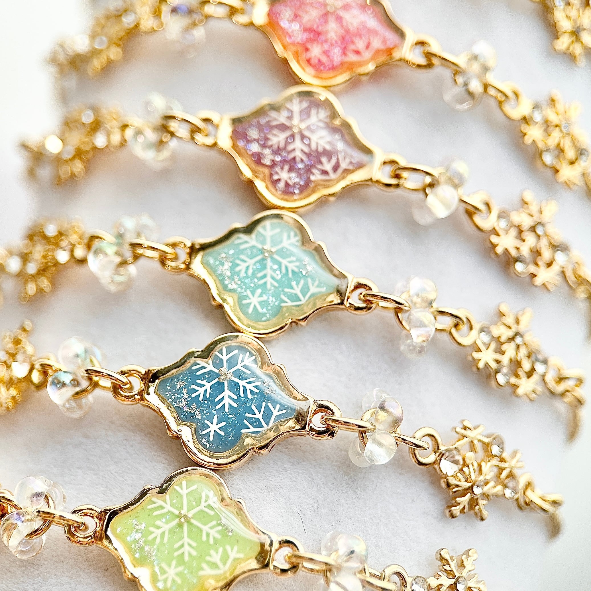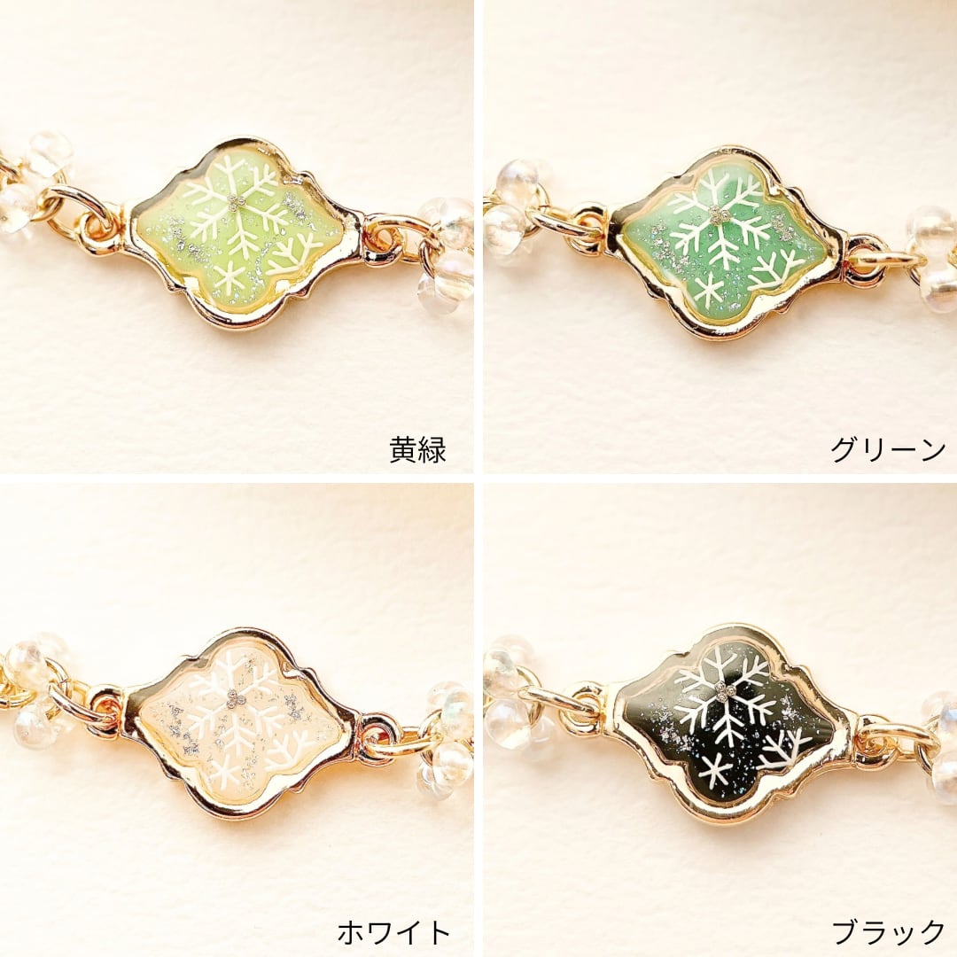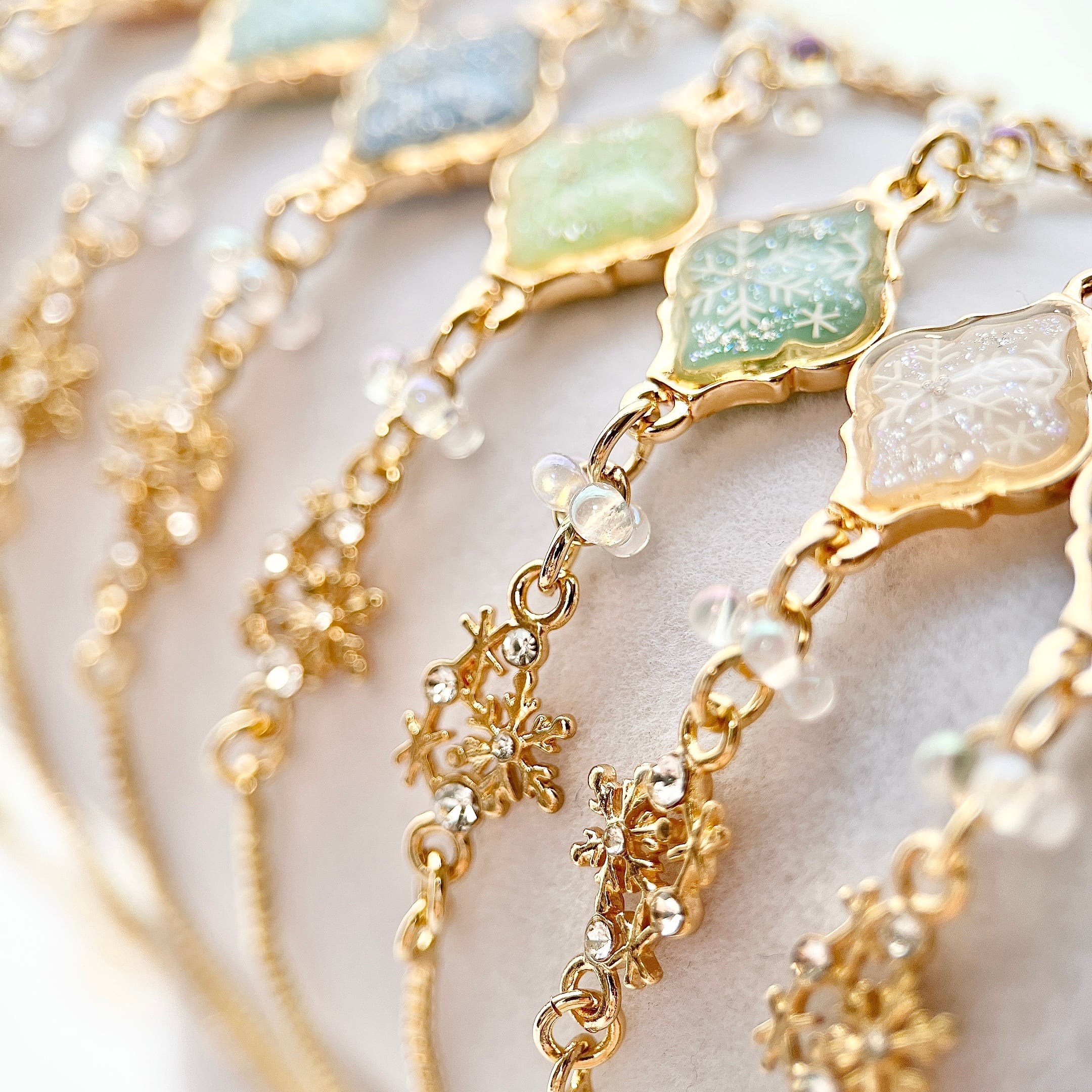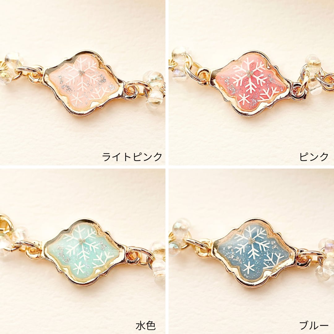 ✨左右には小さなガラスのストーンをあしらった雪の結晶モチーフのチャームを取り付け、冬を存分に感じられるブレスレットです⸒⸒⸒⸒