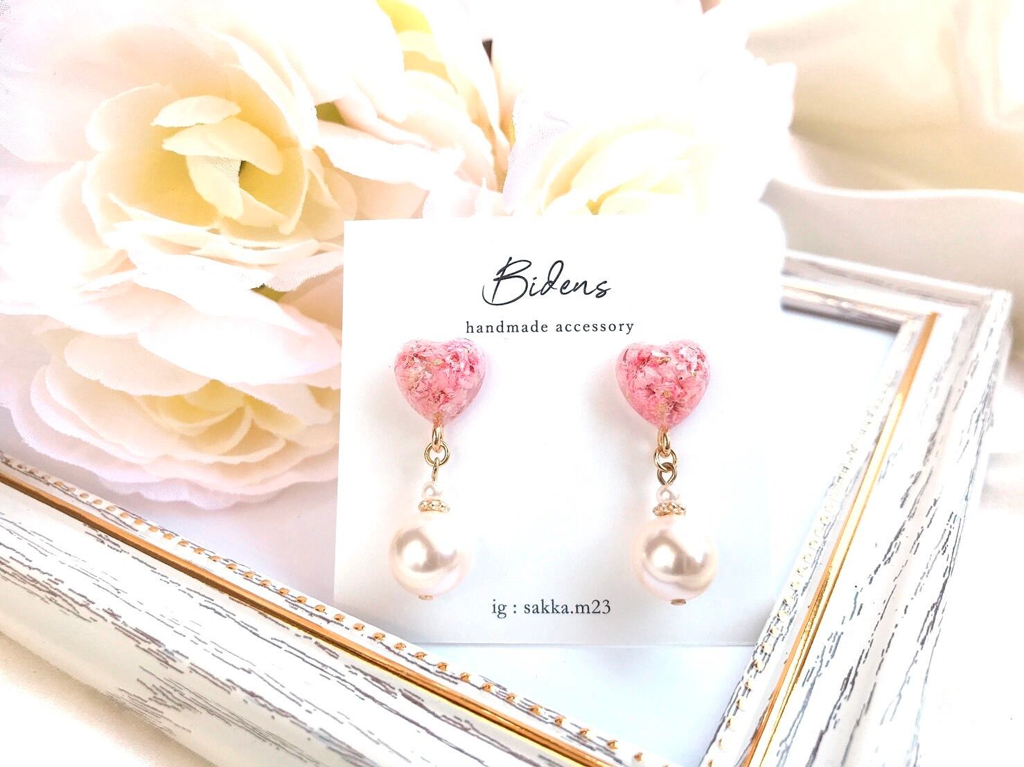 かすみ草と金箔をハート型のレジンに詰め込みました。