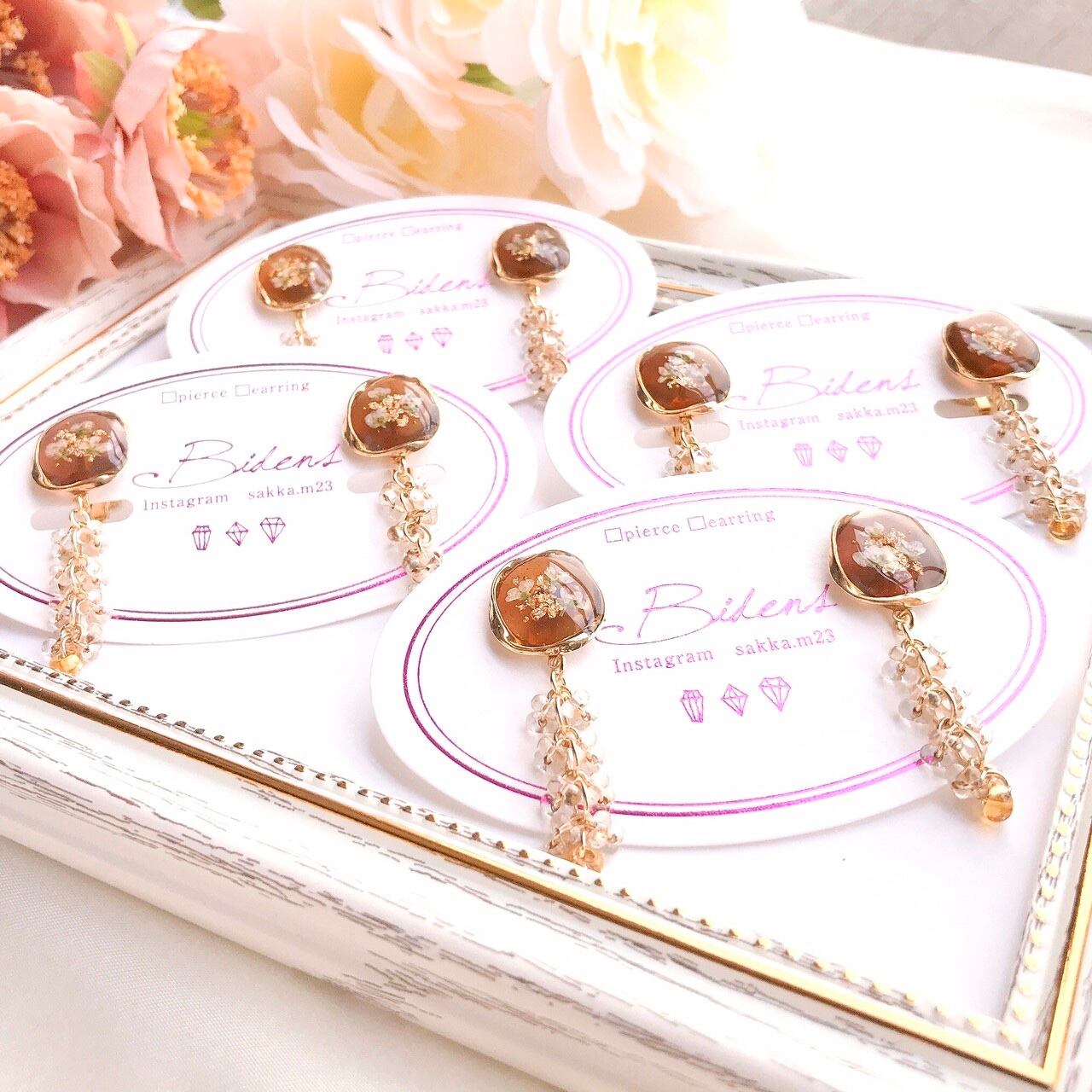 ・ピアス金具やイヤリング金具は強力な接着剤で取り付けており、なるべく部品の脱落が起きないようにしています。