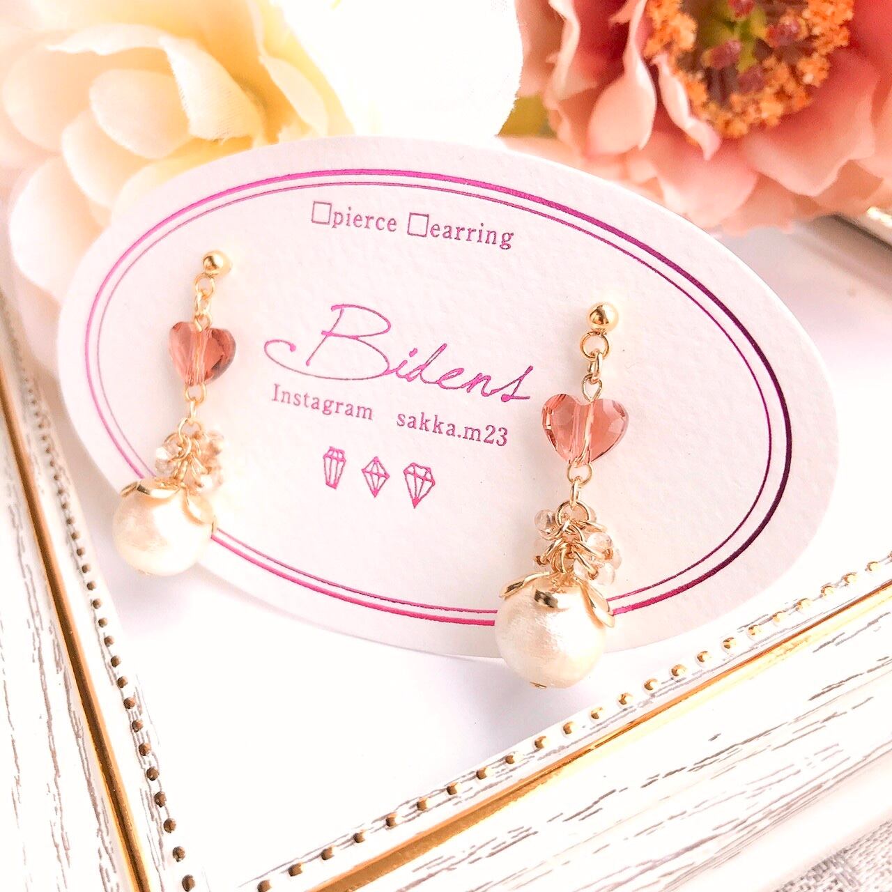 ブラッシュローズのハートスワロフスキーとコットンパールのピアス/イヤリング No.76