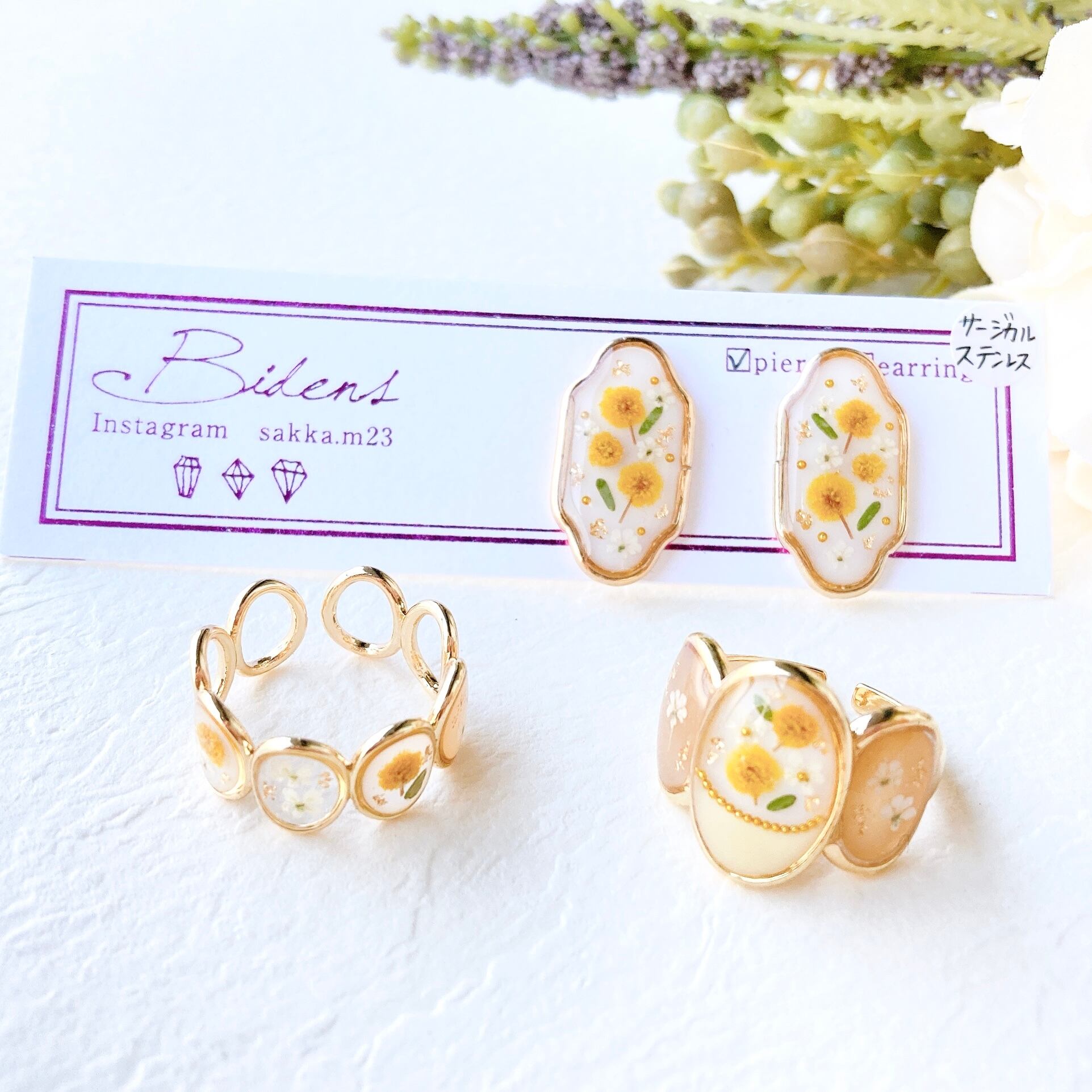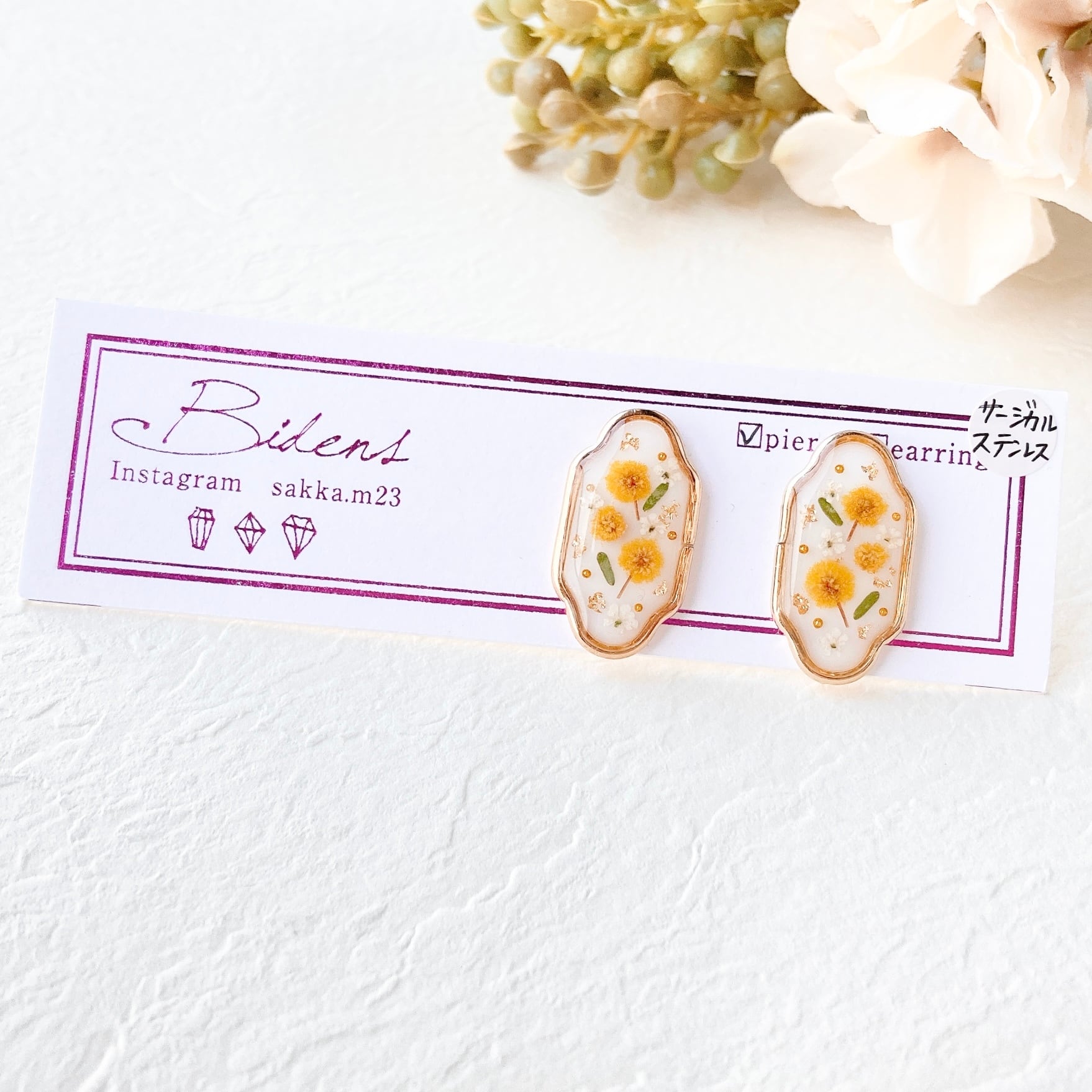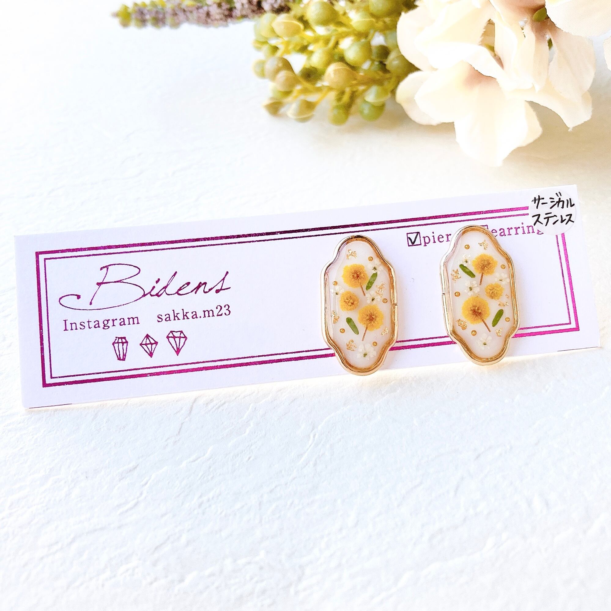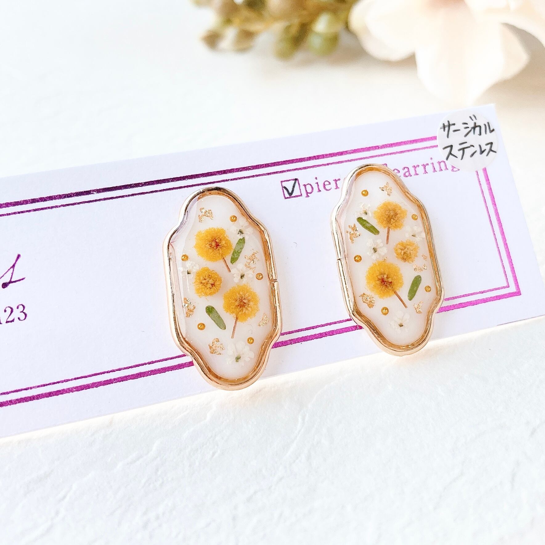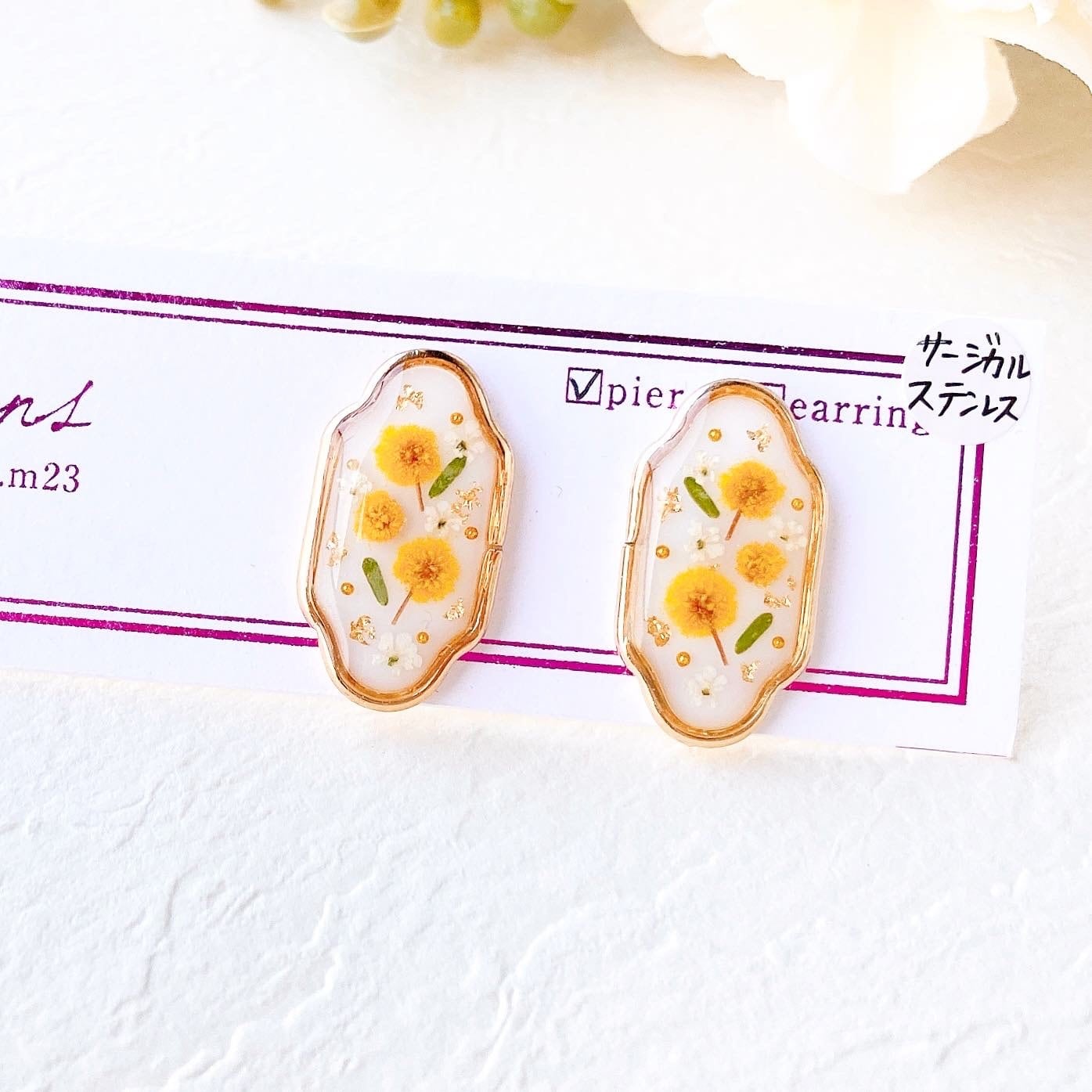 ✨ホワイトベースにミモザイエローが映える春らしいピアス/イヤリング.•*✧