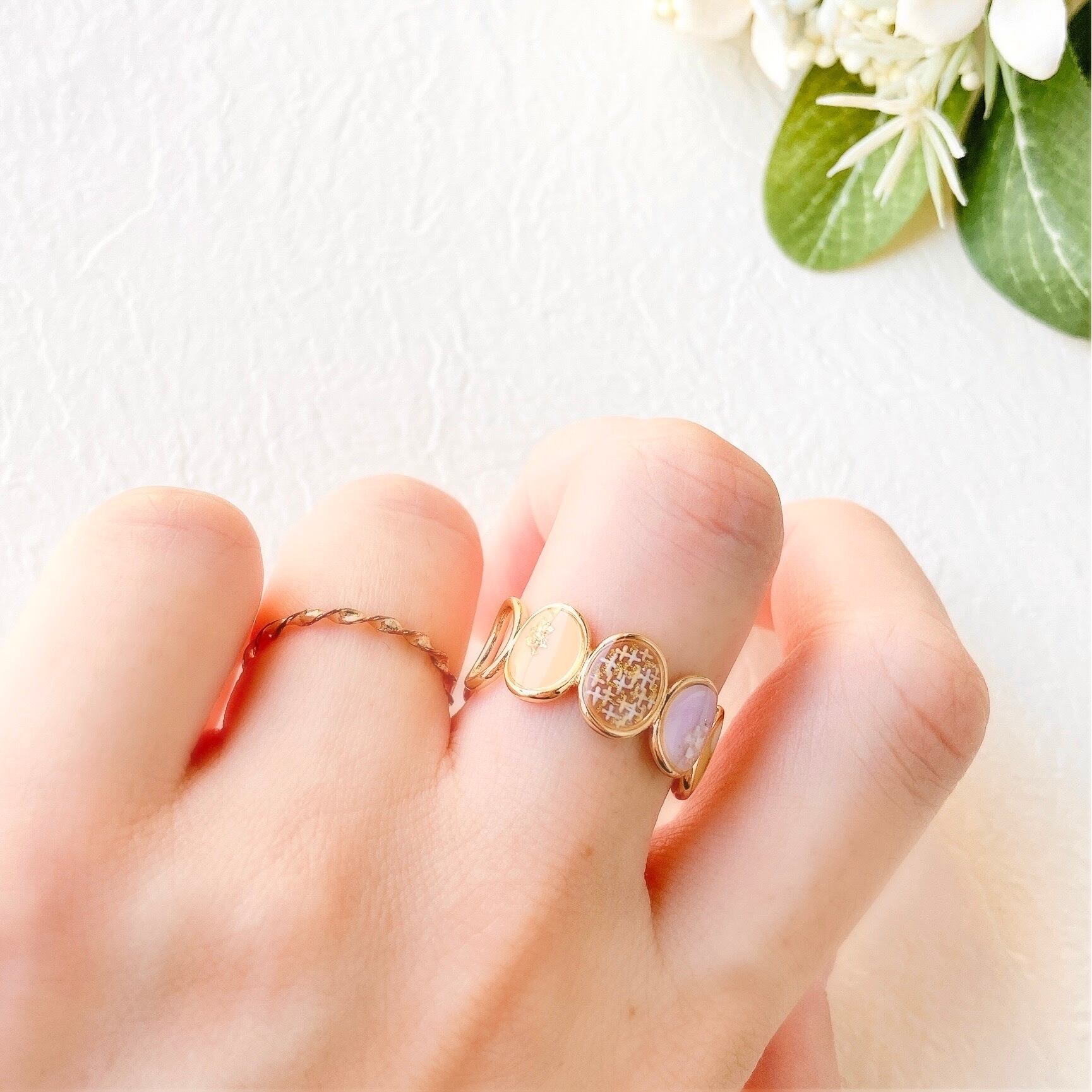 ✨金箔やブリオン、シェル、ラメなどをレジンで4つの枠に閉じ込めたとても繊細なデザイン.•*全体的にくすんだ柔らかいカラーを調合し、肌馴染みの良いオシャレリングに仕上がっています♡