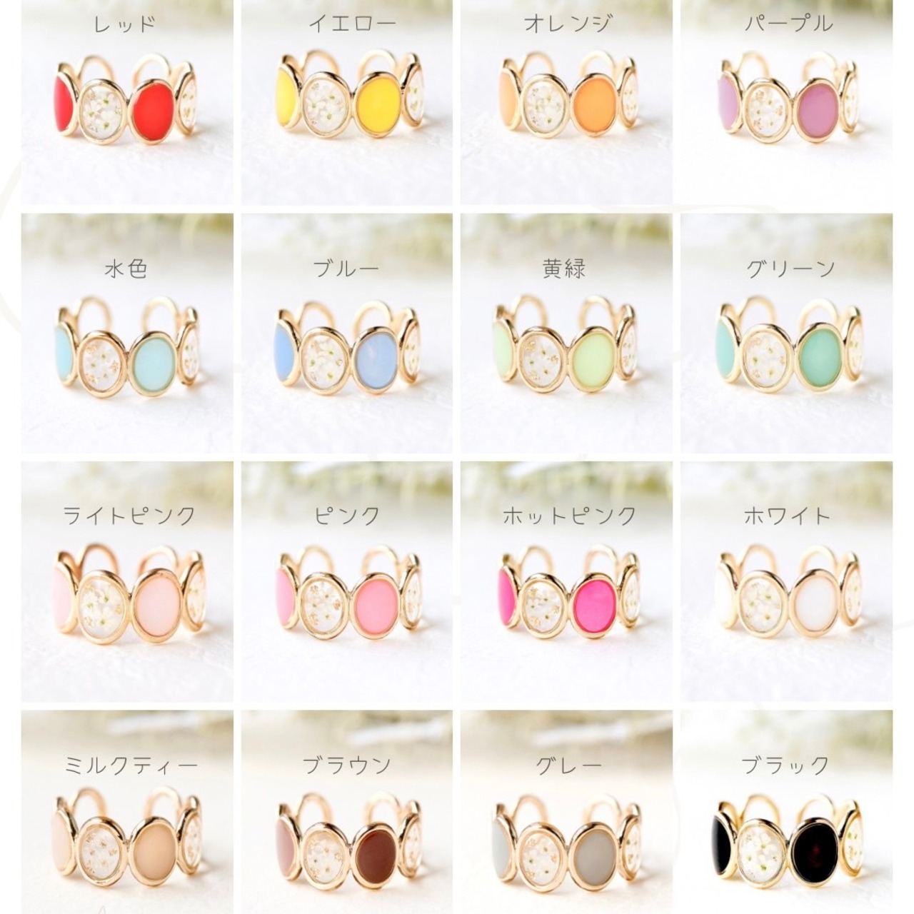 ✨クリアの2枠は本物のお花で、好き嫌いがわかれない白のレースフラワーと金箔で統一したデザインリング⸒⸒