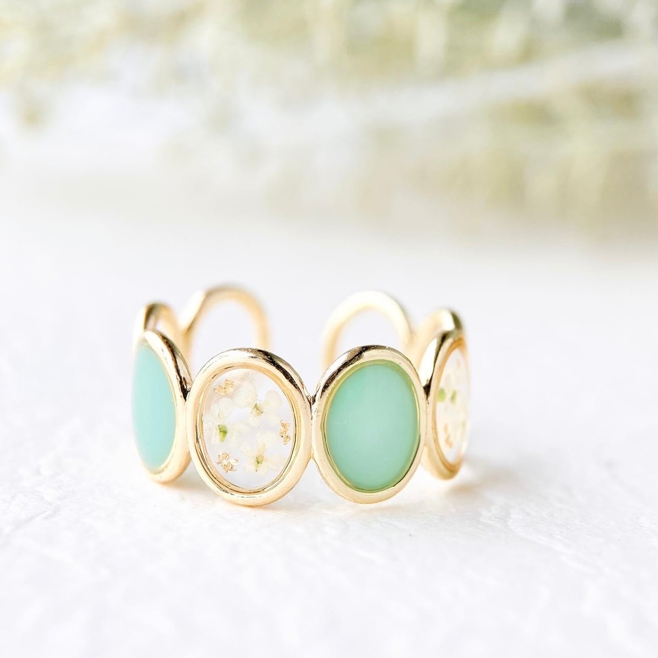 ✨クリアの2枠は本物のお花で、好き嫌いがわかれない白のレースフラワーと金箔で統一したデザインリング⸒⸒