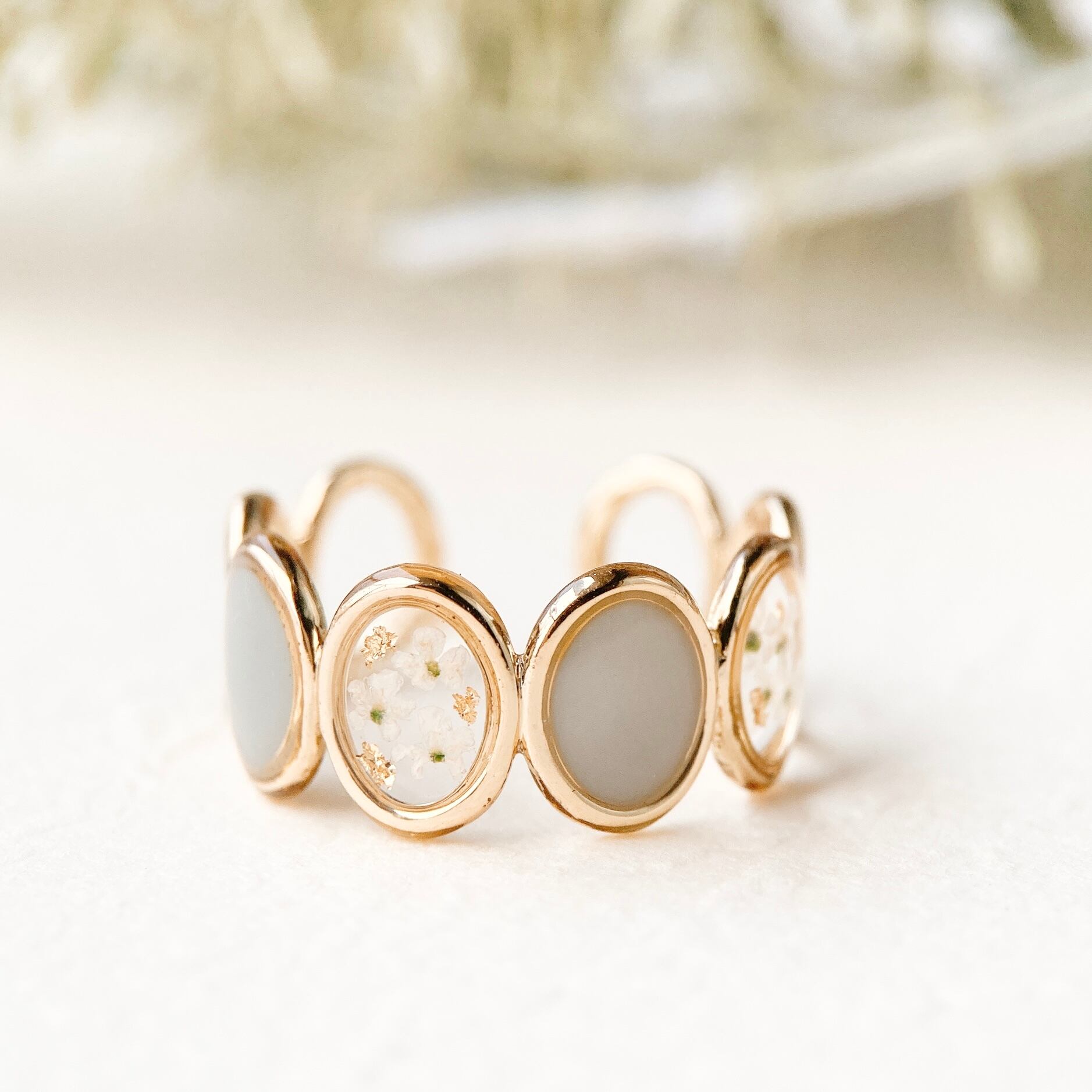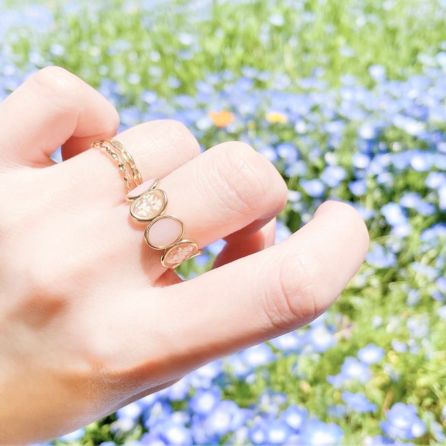 ✨クリアの2枠は本物のお花で、好き嫌いがわかれない白のレースフラワーと金箔で統一したデザインリングです⸒⸒