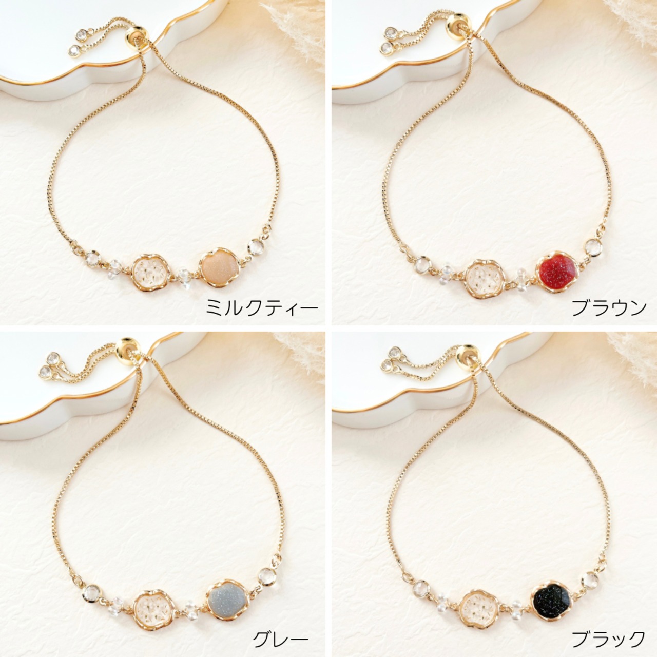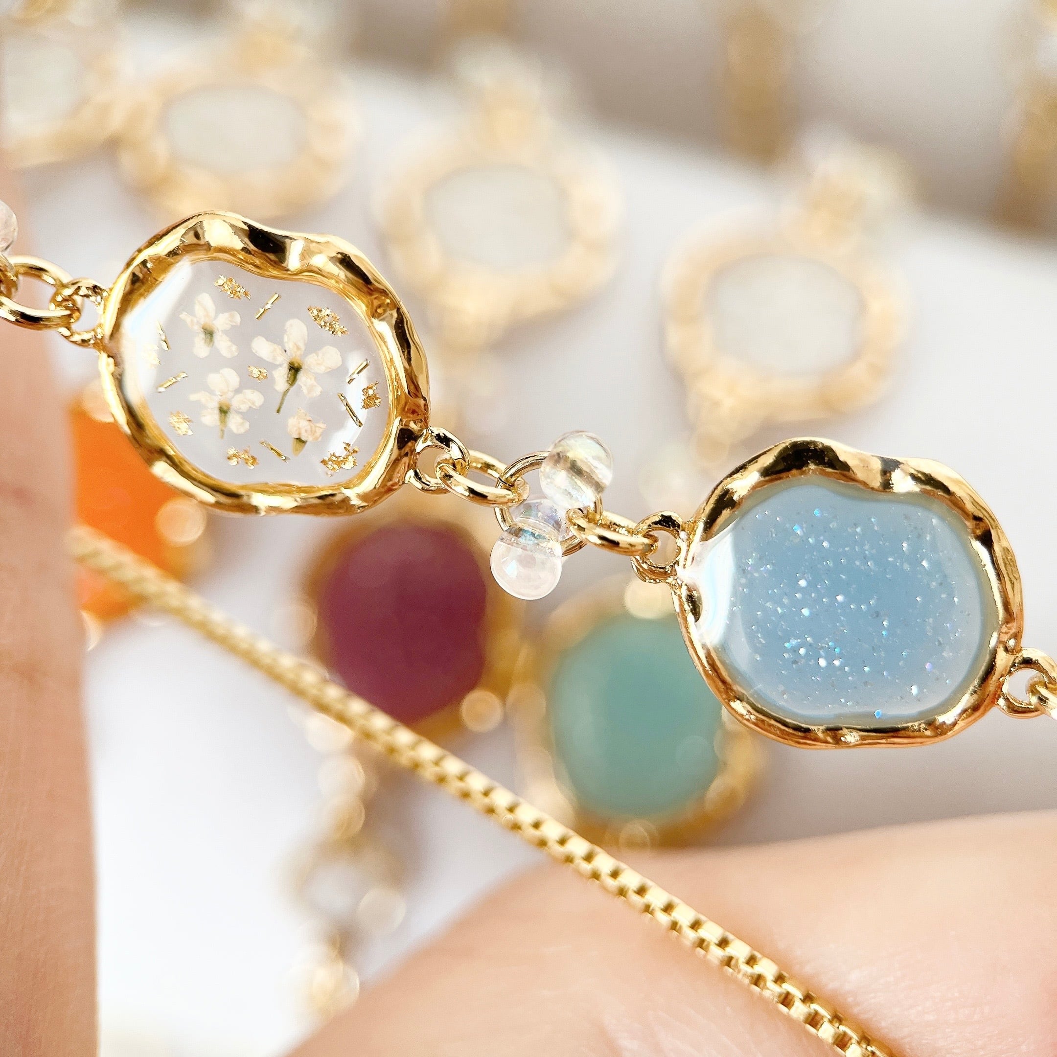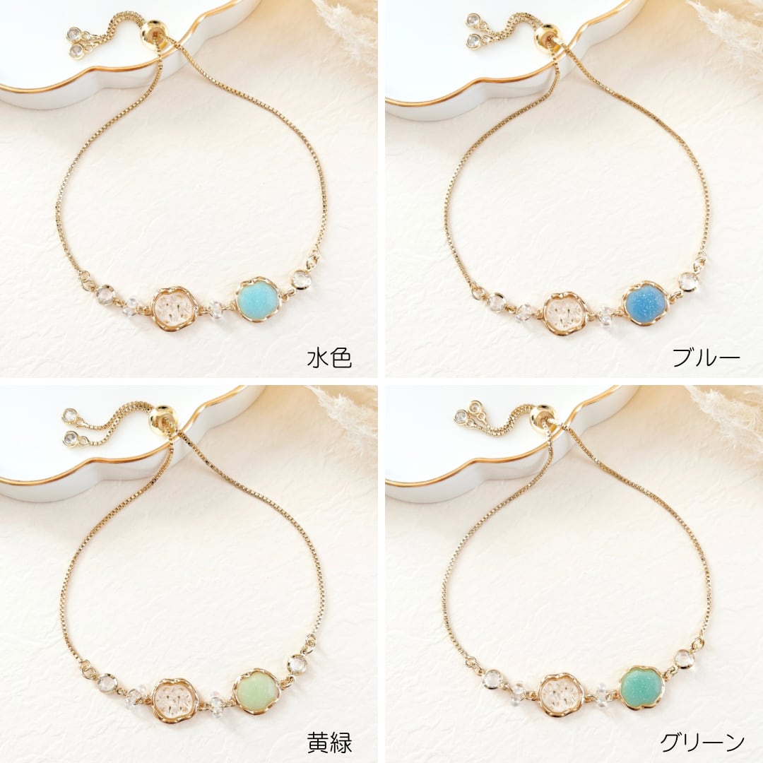 ✨つなぎはオーロラのファルファーレビーズ、両端には透明なカットストーンもさり気なく煌めき、繊細なデザインかつ全体として華奢なイメージでお使いいただけるブレスレットです⸒⸒⸒⸒