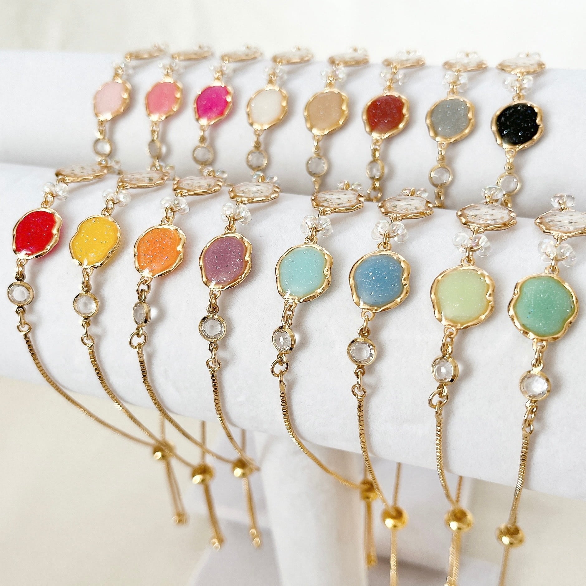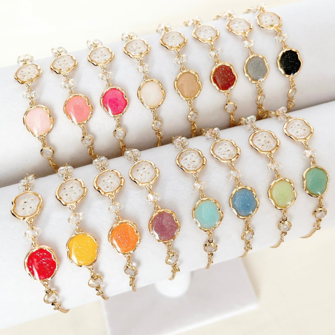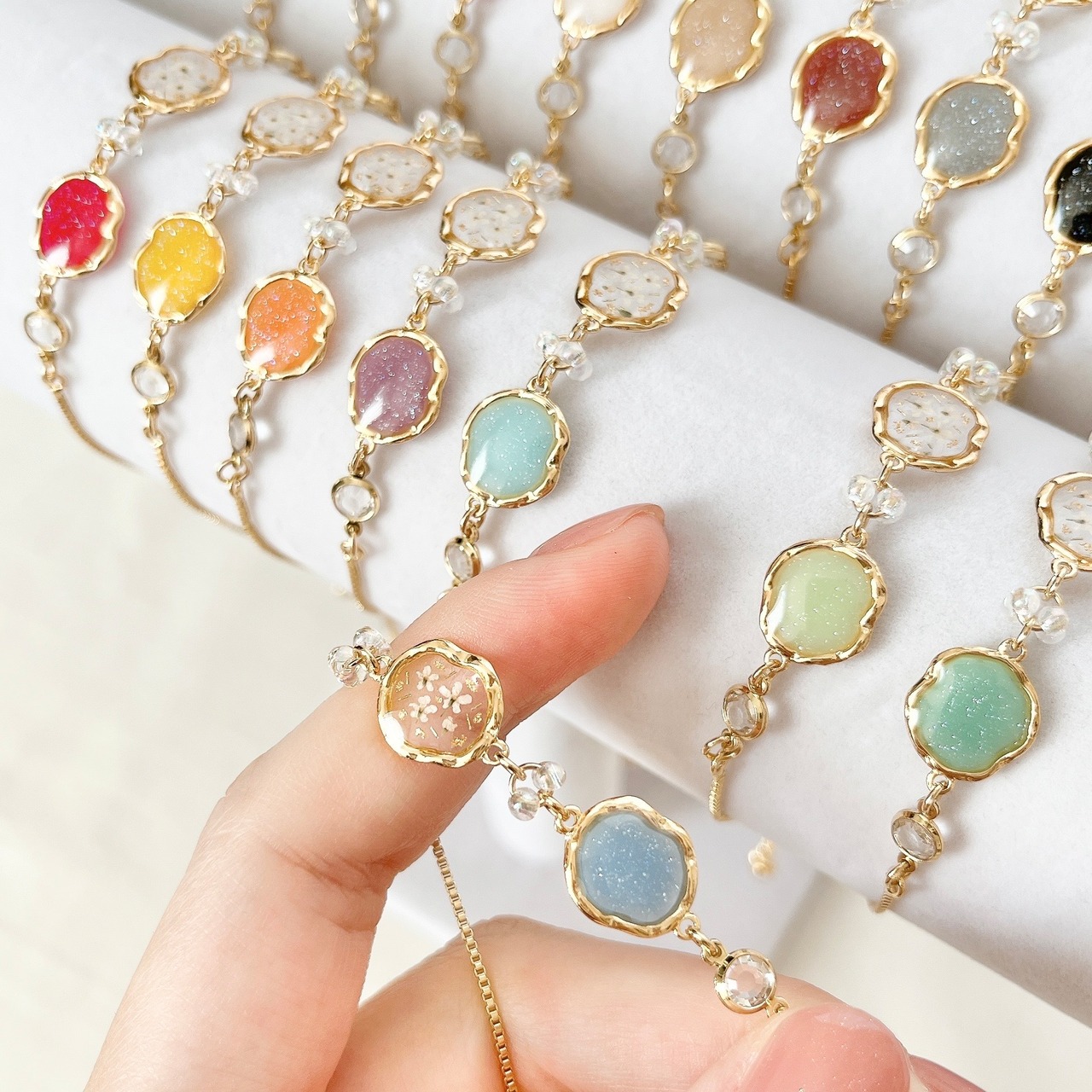 ✨つなぎはオーロラのファルファーレビーズ、両端には透明なカットストーンもさり気なく煌めき、繊細なデザインかつ全体として華奢なイメージでお使いいただけるブレスレットです⸒⸒⸒⸒